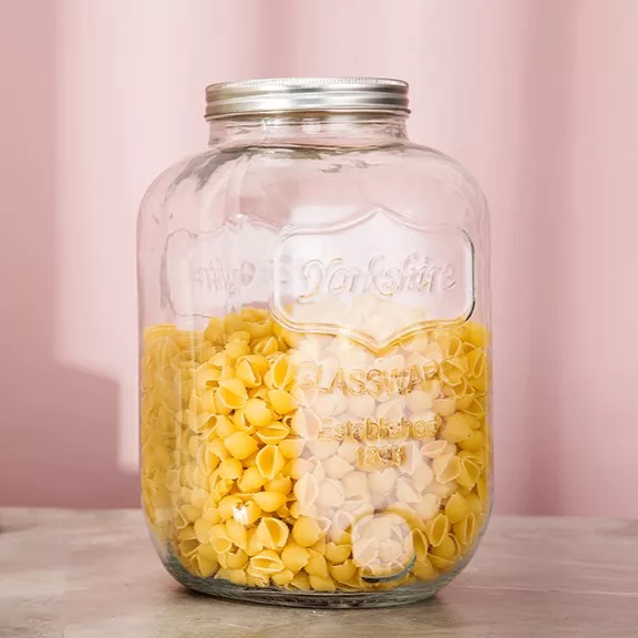 Small Mason Jar with metal lid, which can hold up to one gallon of liquid. This strong storage glass jar comes with thick and durable glass walls, making it ideal for a long-lasting storage solution for your kitchen, business or any other space you like to decorate with Stella Baicø glass jars.